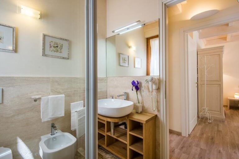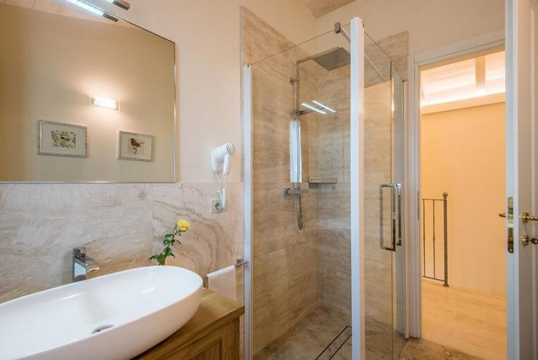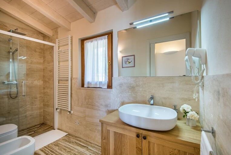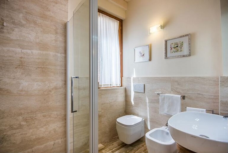 Completa l’appartamento Edera uno spazioso bagno con doccia, realizzato in travertino.